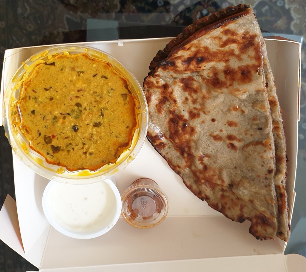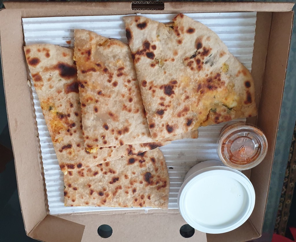 Paneer Paratha: Paratha had a decent paneer stuffing inside and was well quoted with ghee/oil above. It was tasty and medium spicy as per our requirement. It came along with sider, curd and pickle.