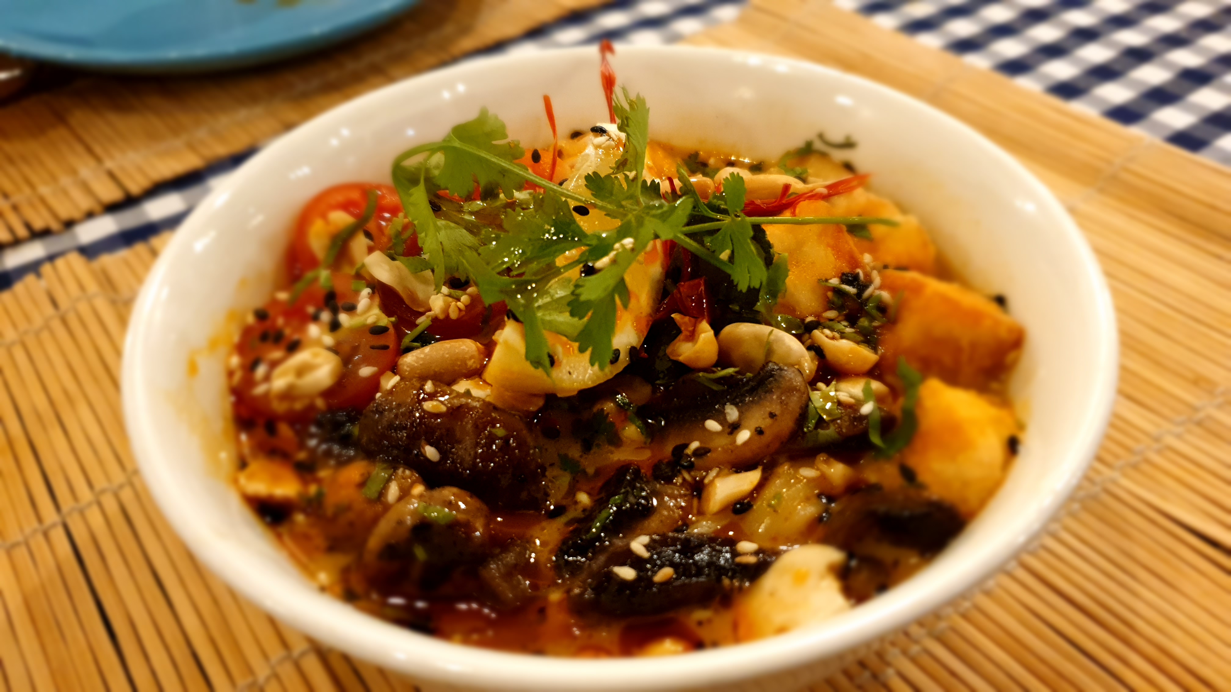 4. Homestyle Ramen: A simple & less spicy dish. Well-cooked ramen with added mushroom, tofu, cherry tomato & topped with peanuts, sesame seeds, chili oil & lime broth.